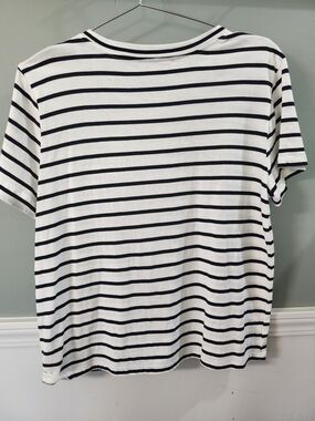 Classic crew-neck tee with black horizontal stripes on white. Short sleeves and relaxed fit. Two bright lemon appliqués add a playful accent. Lightweight, casual top.