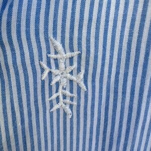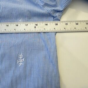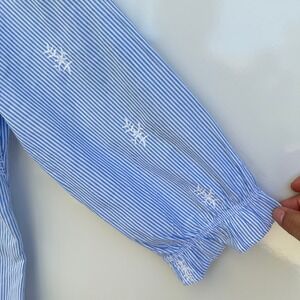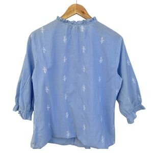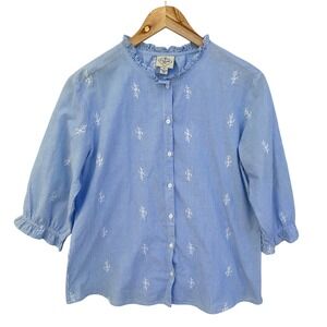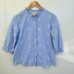 Keywords: St John's Bay, blouse, top, striped, embroidered, ruffle neck, 3/4 sleeve, womens top, casual blouse, button down, size M, blue and white, ruffle cuff, ladies top, womenswear