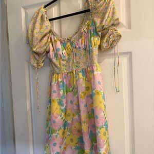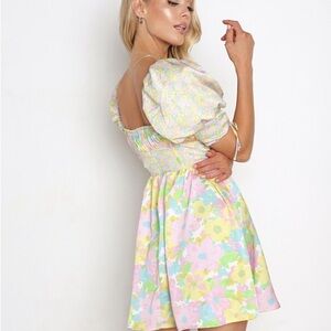 Charming pastel pink floral babydoll dress with puff sleeves and a ruched bodice. Lightweight fabric and a flowy skirt for easy, everyday wear. Feminine pastel print adds a soft, playful touch to your wardrobe.