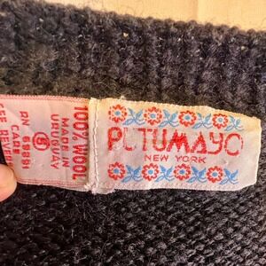 Wrap yourself in the whimsical charm of this Putumayo New York cardigan, a true masterpiece of Uruguayan craftsmanship. This 100% wool piece features vibrant, hand-embroidered floral and mushroom motifs that dance across a deep black knit, creating a look that is both cozy and artistically expressive. The oversized silhouette and natural wood-tone buttons offer a timeless, bohemian feel that is as comfortable as it is stylish. This vintage treasure is in excellent condition, ready to bring a touch of storybook magic to your wardrobe. Perfect for a crisp autumn walk, a cozy coffee date, or a creative day at the studio.