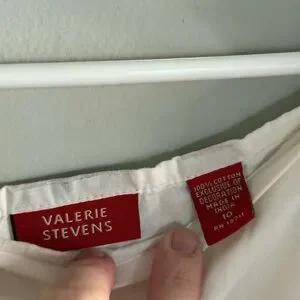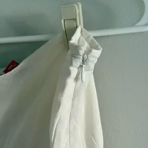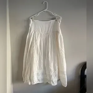 Lightweight cream A-line skirt with soft gathers. Subtle lace trim along the hem. Flowy silhouette for easy styling. Breezy fabric moves gracefully.