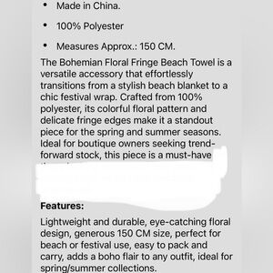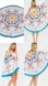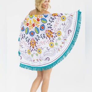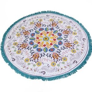 Large round beach towel with vibrant floral mandala print. White background with multicolor motifs and teal fringe trim. Lightweight and perfect for beach or picnic use.