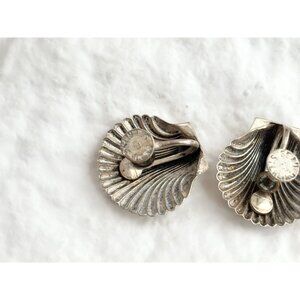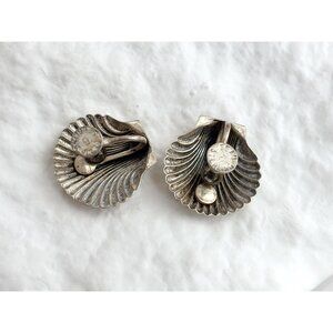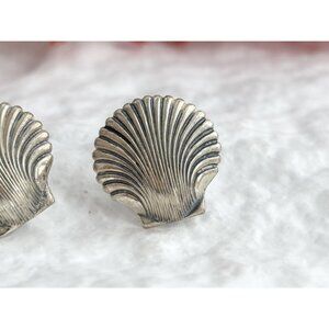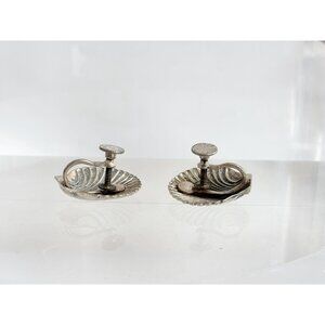 Fantastic sterling silver vintage seashell shaped stud earrings. Screw back style. Round shaped with a scalloped edge. Lovely pair. Marked as sterling, did test positive for sterling silver via chemical testing. Sterling marking is on the posterior of the enclosures as seen in photos.