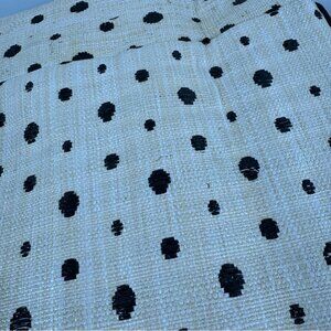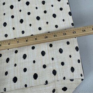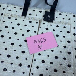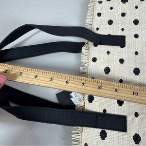 • Design: Cream base with black polka dot pattern, double black handles, front pocket panel, fringe trim along top edge