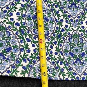 Short sleeve shift dress features a vibrant blue and green damask floral print on a crisp white background. Crafted from a comfortable cotton blend with a hint of stretch, this piece includes a full bodice lining and a concealed back zipper for a polished fit. Functional side pockets add a practical touch to the classic silhouette, making it an ideal choice for garden parties, brunch, or professional settings.
