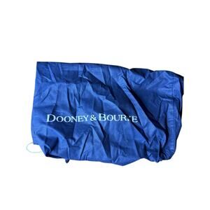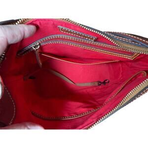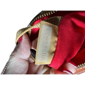Adjustable leather strap with buckle detail, exterior back zip pocket, and top zip closure. Interior is lined in signature bright red fabric with multiple pockets, key leash, and Dooney & Bourke leather tag. Includes original Dooney dust bag.