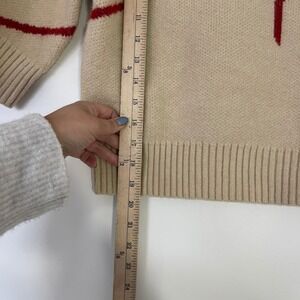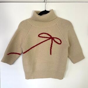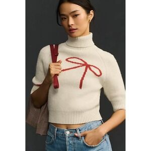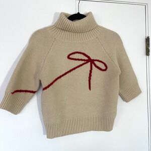Keywords: En Saison, knit sweater, mock neck, bow detail, cropped sweater, short sleeve, cream sweater, red graphic, cozy knit, fall fashion, winter style, casual chic, feminine, festive