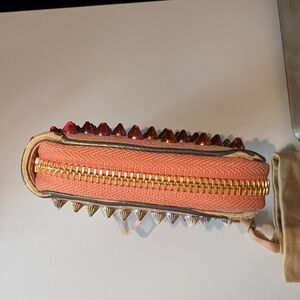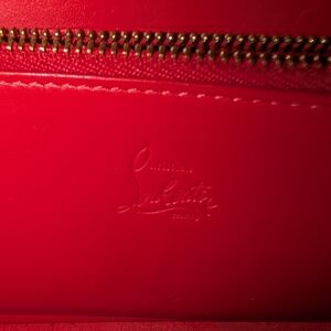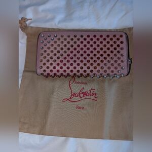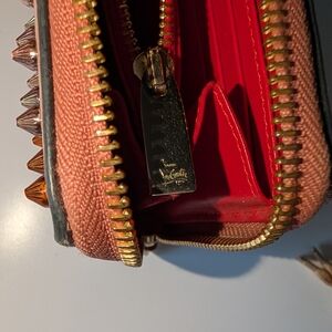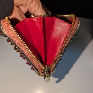 GUC Authentic Christian Louboutin multicolored Panettone studded zipper wallet. This wallet has some corner rubbing and some discoloration in the coin compartment (pictured) but overall it is still in really great condition. The red leather interior and pink leather exterior leather is mint and there are no other callouts than stated above. Zippers are zippy. Comes with a Louboutin-branded dust bag and a COA 8/10.