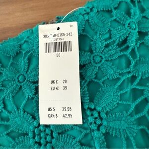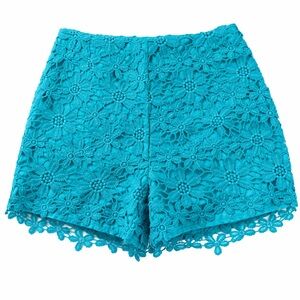 NWT, never worn. High waist teal floral lace crochet shorts with a scalloped hem. Lightweight lined design offers comfortable coverage and a feminine look. Versatile piece that dresses up for outings or pairs casually for daytime.