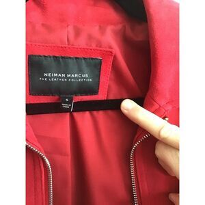 This jacket is a size small and has a solid pattern. The outer shell material is leather, while the lining material is also leather. The jacket is from the Neiman Marcus brand and is perfect for any season.
