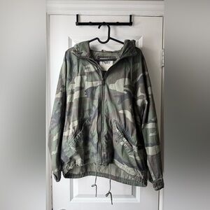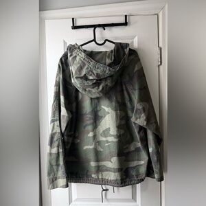Lightweight zip-front jacket with camouflage trim. Hooded style with practical pockets. Neutral olive camo design for everyday wear.