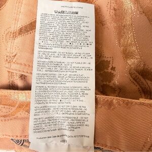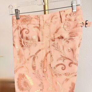 Crafted in Italy, this rare find features a delicate blush pink denim base entirely transformed by a shimmering rose gold metallic foil "laminated" coating. The signature ETRO paisley motif is rendered in a high-shine, liquid-metal finish that catches the light beautifully.