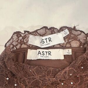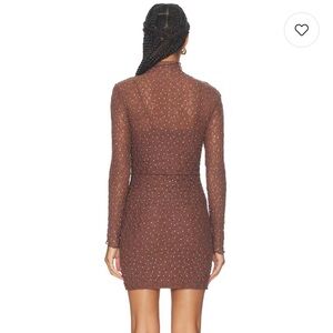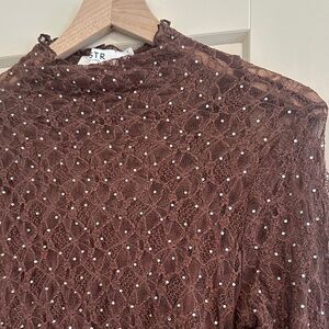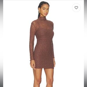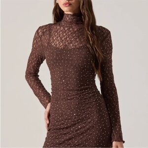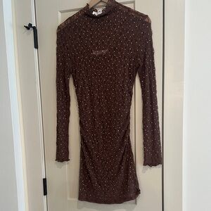Elegant brown long-sleeve mock neck dress with subtle sparkle embellishments. Slim, body-skimming silhouette. Super soft, with athletic wear type slip built in (it is removable tho). Lace textured fabric.