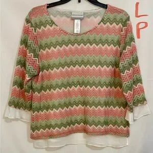 Chic blouse with chevron design. Features pink and green hues. Ideal for casual wear.