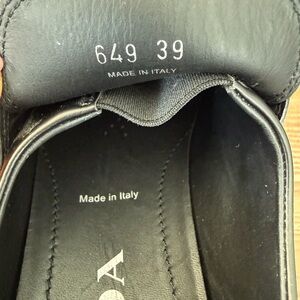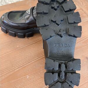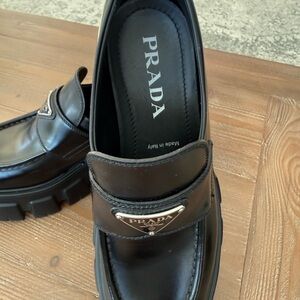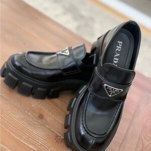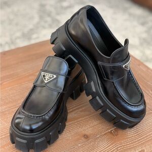 Authentic Prada Monolith loafers in brushed leather featuring a bold chunky lug sole and signature triangle logo. These iconic shoes combine classic loafer style with a modern, edgy platform design—perfect for elevating any outfit.