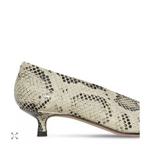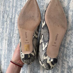 Sleek pointed-toe flats with a bold snake-print upper. Smooth black leather insole for comfort. Elegant neutral tones for versatile styling. Lightweight design suited for everyday wear.