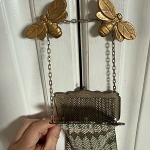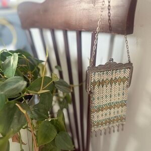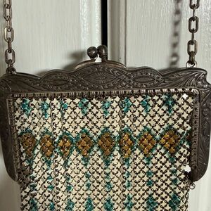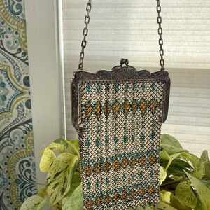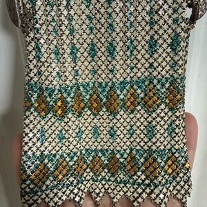 Beautiful 1920’s antique Mandalian Mfg. Co. enamel mesh purse featuring an intricate hand-painted design in teal and gold tones.