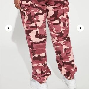 Bold pink camo print. Wide leg silhouette with cargo pockets. High-rise waist for a flattering fit. Casual yet edgy streetwear style. Never worn size sold out on website