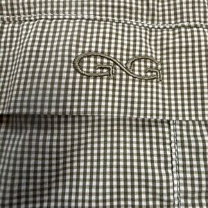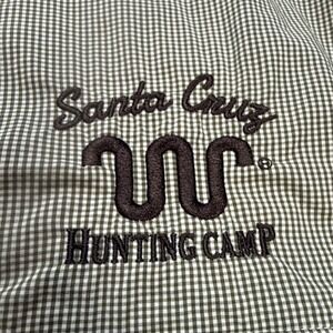 GameGuard Outdoors short sleeve fishing shirt in a green and white micro-check pattern. This performance button-down features Santa Cruz Hunting Camp embroidery on the chest and is built for the field with UPF 30+ sun protection, flexible comfort stretch, and mesh-lined back venting for breathability. Designed with vertical chest pockets and a classic collar, it offers a functional utility style suitable for hunting, fishing, or casual outdoor wear.