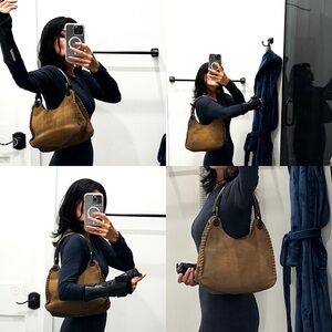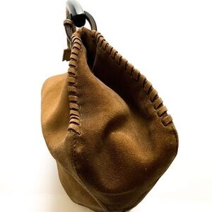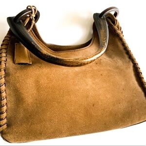 Tom Ford for Gucci Whipstitch Carmel Suede Leather Handbag with Wooden Handle and removable Gucci key fob. 2002 collection, I believe. GUVC, vintage preloved condition, wear & markings detailed in photos, priced accordingly. There are some small water marks on