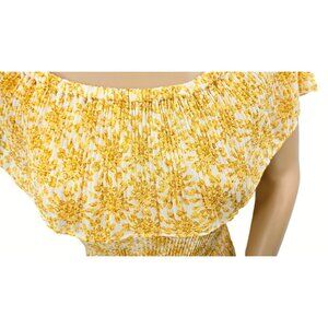 Beautiful flowy Michael Kors midi dress in a soft cream base with vibrant yellow floral print. Features an off shoulder neckline with a pleated texture throughout and a matching waist tie that creates a flattering silhouette. Lightweight and airy, perfect for spring and summer occasions, vacations, brunch, or garden parties.
