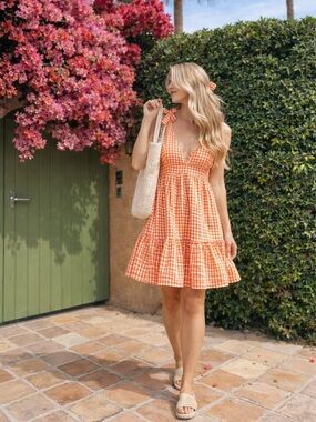 orange gingham dress, gingham mini dress, tie strap dress, tiered mini dress, summer dress, preppy style dress, cottagecore dress, feminine dress, flouncy dress, v neck mini dress, orange white dress, casual chic dress, vacation outfit, brunch outfit, picnic outfit, spring summer dress, lightweight cotton blend dress, fit and flare mini dress, resort wear dress, effortless style dress, classic gingham print, southern style inspired, Ralph Lauren style, Lilly Pulitzer inspired, preppy chic aesthetic