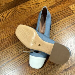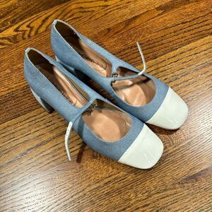 Anthropologie Vicenza Blue White Textile Buckled Strappy Mary Janes Chunky Heels