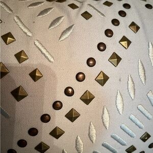 Enhance your living space with this elegant decorative pillow. This decorative throw pillow features a gray-colored fabric with geometric embroidery and brass-toned studded accents. It adds a touch of luxury to any room. Size is 19”X11”. In excellent condition with no rips or stains.
