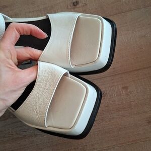 Super fun and funky white leather platform block heel sandal from quality shoe retailer, l'Intervalle; adjustable ankle strap for a secure fit; clean, modern silhouette with a nod to Y2K and 70's style; versatile white to pair with anything from work trousers to dresses this summer season!