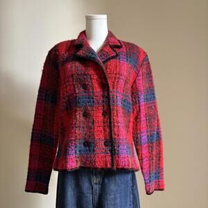 NWT vintage red plaid jacket with double breast buttons down the front, black hemlines, mohair wool blend, gorgeous colors, perfect condition. Tagged at $178. Great little jacket for work, school, an evening out, etc!