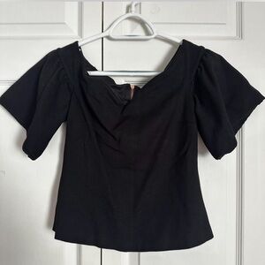 Chic off-shoulder neckline with gentle drape. Short puff sleeves add volume. Tailored bodice for a flattering silhouette. Clean, versatile black shade for easy styling.