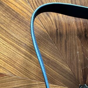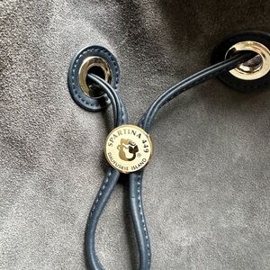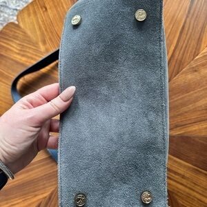Soft gray suede shoulder bag with leather trim. Single strap and cinch-style drawstring accent. Subtle metal logo hardware for a refined touch. Roomy, casual silhouette for everyday wear. Small hole on the bottom of inside lining.