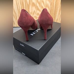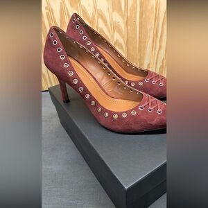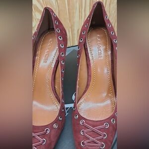 These are Coach Varick pump in a red/burgundy suede with lace-up grommet detailing.
