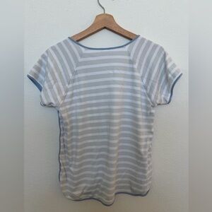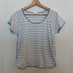 muted blue and white stripe with contrasting blue trim