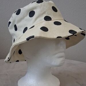 Cute summer style bucket hat with bold black polka dots. Soft cream canvas fabric. Casual, playful accessory. lightweight and perfect for summer, Beach days, or casual outfits. Easy to style with many outfits. In good pre-owned condition. From a smke-free, pet-free home. One size.