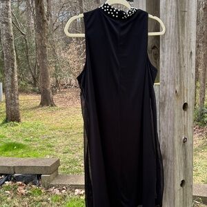 Chic black sleeveless mini dress with an elegant pearl-trim neckline. Lightweight, flowing fabric offers comfortable movement. Simple silhouette perfect for evening events and dressy occasions. Easy to style with heels or statement accessories.