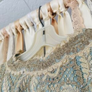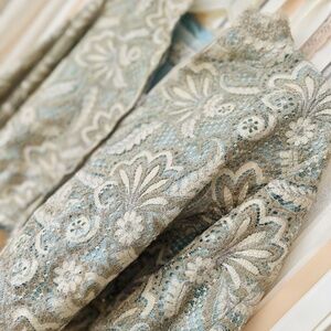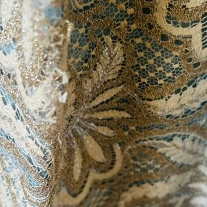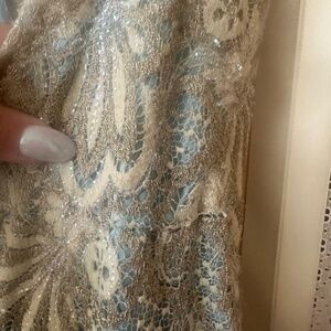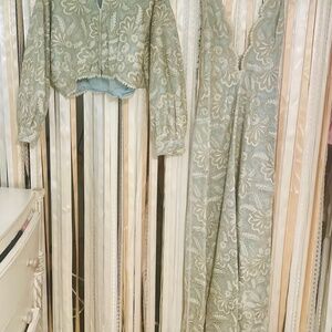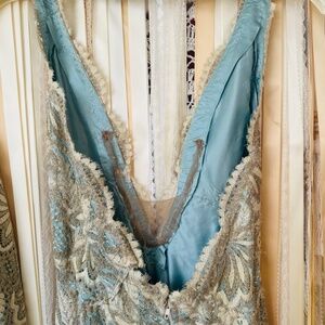 Gorgeous vintage evening gown! Really a special find! This one of a kind, custom made evening gown with matching was designed by Dorothy Egan in the 1950's. With it's plunging neckline, gorgeous lace and tiny sparkly beaded fabric, and gorgeous matching jacket, it's a show stopper! It has a few threads loose here and there that may need some love and has a little normal wear (shown in the pictures) but still in good shape. Also it shows signs of being taken in and some threads that easily be taken out. See pics. Still in really good condition and beautiful! Perfect for the stage, a photo shoot, or special event wear you really want to stand out!