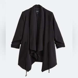 Sophisticated black draped jacket designed for a polished look. Features a flowing open front and tailored sleeves for easy layering. Versatile black color pairs well with work or evening outfits. Comfortable, lightweight fabric for all-day wear.