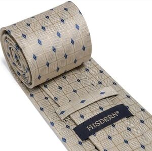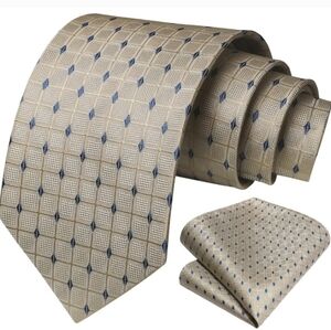 Hisdern Beige & Blue Checkered Tie with Matching Pocket Square, Silk Blend, NIB