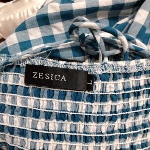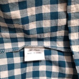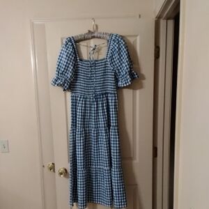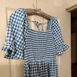 Lightweight blue and white gingham midi dress. Smocked bodice with square neckline. Puff sleeves with ruffle detail. Tiered skirt for a flowy silhouette. Casual and feminine.