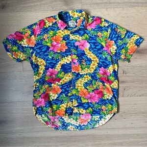 Bright tropical shirt by Jams World. Features bold floral patterns in blue, yellow, pink, and green.