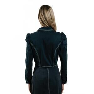 The Aurore Jacket by LOVE THE LABEL is a stylish choice in Pagent Blue for women who appreciate a minimalist look. Crafted from durable denim, this dark-wash jacket features long sleeves and a classic collar neckline, ensuring both style and comfort. Designed without pockets for a streamlined silhouette, it has a practical button closure. Perfect for travel, this patterned piece enhances any fall ensemble with ease.