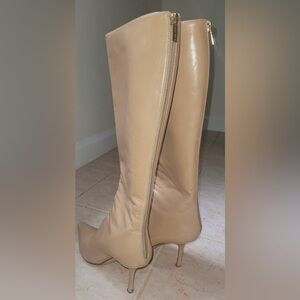 Chic knee-high boots by Jimmy Choo. Pointed toe and sleek leather shaft. Smooth, minimalist silhouette. Neutral beige complements many looks.