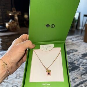 Fun Kate Spade necklace with a popcorn pendant. Features gold chain and pink accents. Adds whimsy to any look.