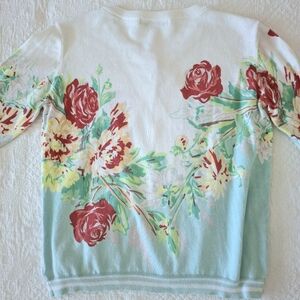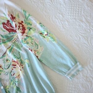 Very hard to find design Vintage 50's feel Button up cardigan 3/4 sleeve Striped bands at cuffs & hem Ribbon placket along button edge Cotton blend Floral roses pattern Mint green, turquoise blue, red, yellow, white, gray Stretchy knit 36" bust, 20.5" long, 18.5" shoulder to cuff Very nice condition *** 20% off 2 or more items bundled from my closet, plus you get combined shipping! cardi spring summer lightweight layer grey cabbage bouquet statement cottagecore robins egg pale pastel light beach boho bohemian coquette girl cropped feminine girly preppy