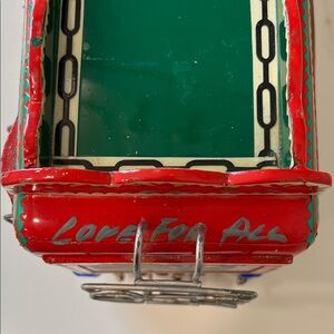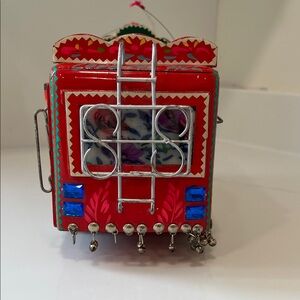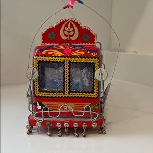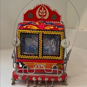 Vibrant handmade red wooden Pakistani truck with intricate floral and animal and geometric detailing. Colorful accents! Durable construction made for display or gentle play. Bright red finish adds a cheerful focal point. Bells on bottom of truck. Metal ladders, rails, and antenna intact. Some bells missing, some sticker detail missing, one jewel headlight missing. Top piece missing.