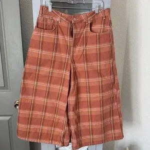 Rust plaid wide-leg crop jeans. Soft woven fabric with plaid detail. Five-pocket style with zipper fly and button closure. Casual, relaxed fit. Great for layered looks. So so cute! Worn once!