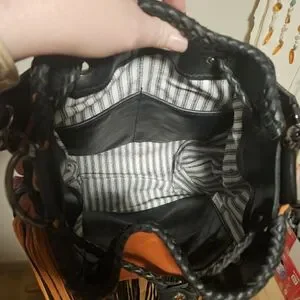 Handcrafted fringed bucket bag from Wild Horse Leather Company. She calls this one a Mini Kacy! In vibrant rust with black and red accent fringe. Soft leather construction with decorative tooling and braided drawstring for secure closure. Bold, bohemian style that complements casual and festival looks. Lightweight and easy to carry for everyday use. Genuine Swarovski crystals. Handcrafted from start to finish. Made in the USA