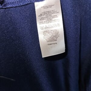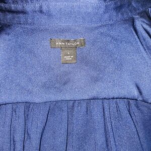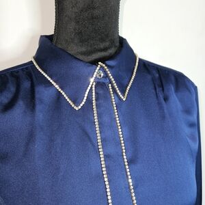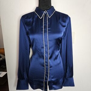 Sleek navy satin button-down blouse by Ann Taylor. Decorative light trim along collar and placket. Long sleeves with tailored cuffs. Smooth, lustrous finish for a polished look.