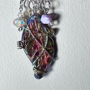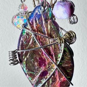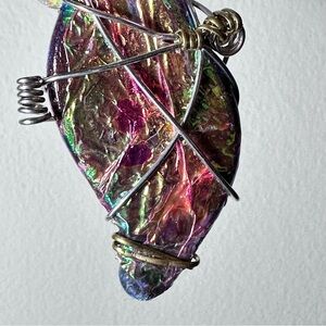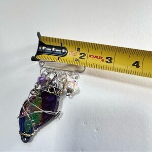 Unique wire-wrapped brooch with vibrant multicolor design. Features iridescent hues and decorative beads. Perfect for adding flair to any outfit.